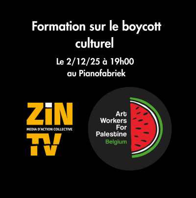 Conscient.es des réticences et objections que le boycott culturel peut susciter, avec le collectif Art workers for Palestine nous organisons un évènement-formation sur la question le 2 décembre à 19h00 au Pianofabriek. Cette soirée sera articulée entre une projection d’une conférence d’Eyal Sivan, réalisateur israélien et auteur avec Armelle Laborie du livre “Un boycott légitime, Pour le BDS universitaire et culturel de l’État d’Israël” et des moments de discussion et d’informations.
